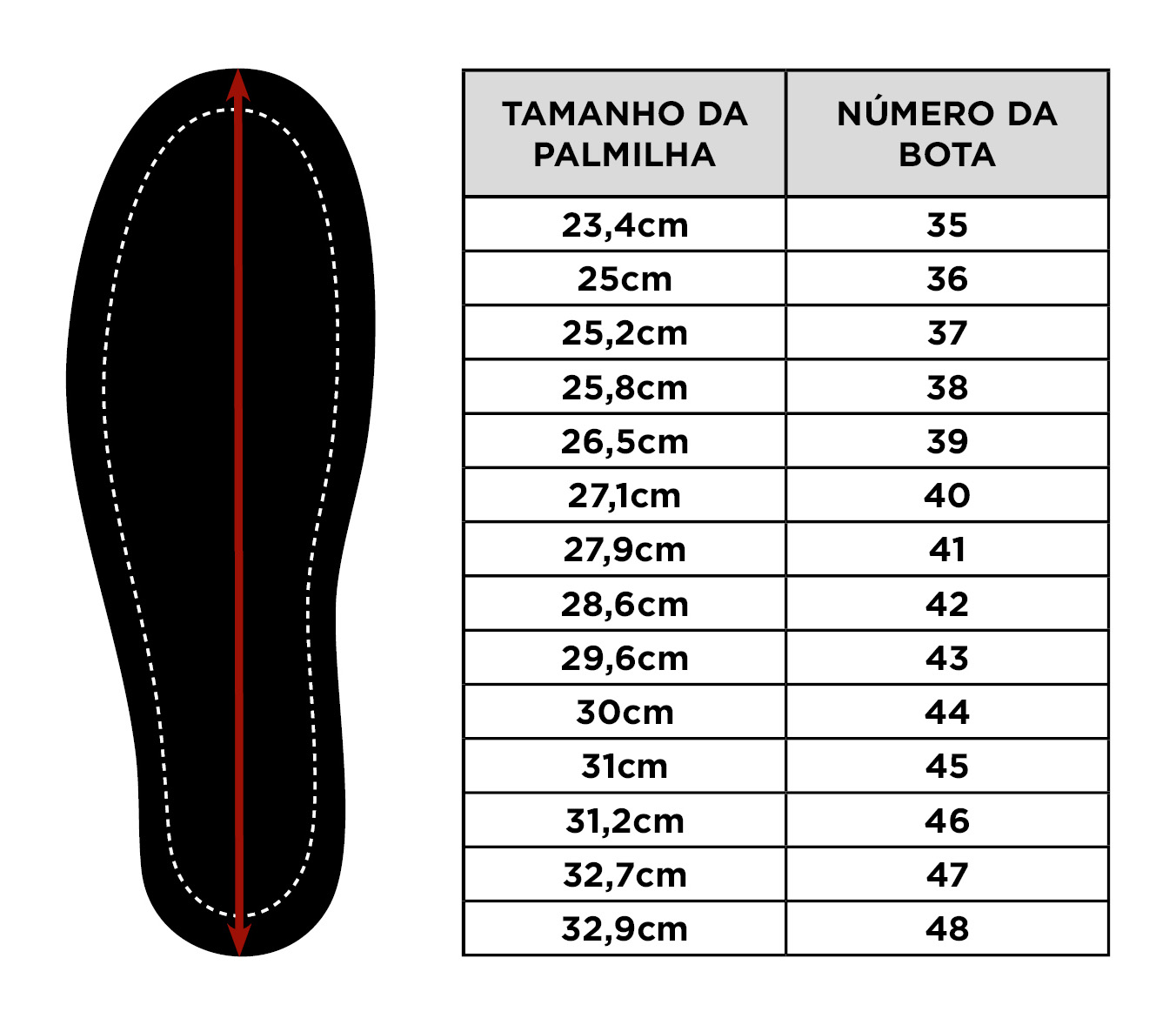 Pegue a palmilha de um calçado que você usa e acha confortável. Meça o comprimento com uma régua e compare com a tabela ao lado. Se ficar na dúvida entre dois números, escolha o maior para garantir mais conforto.