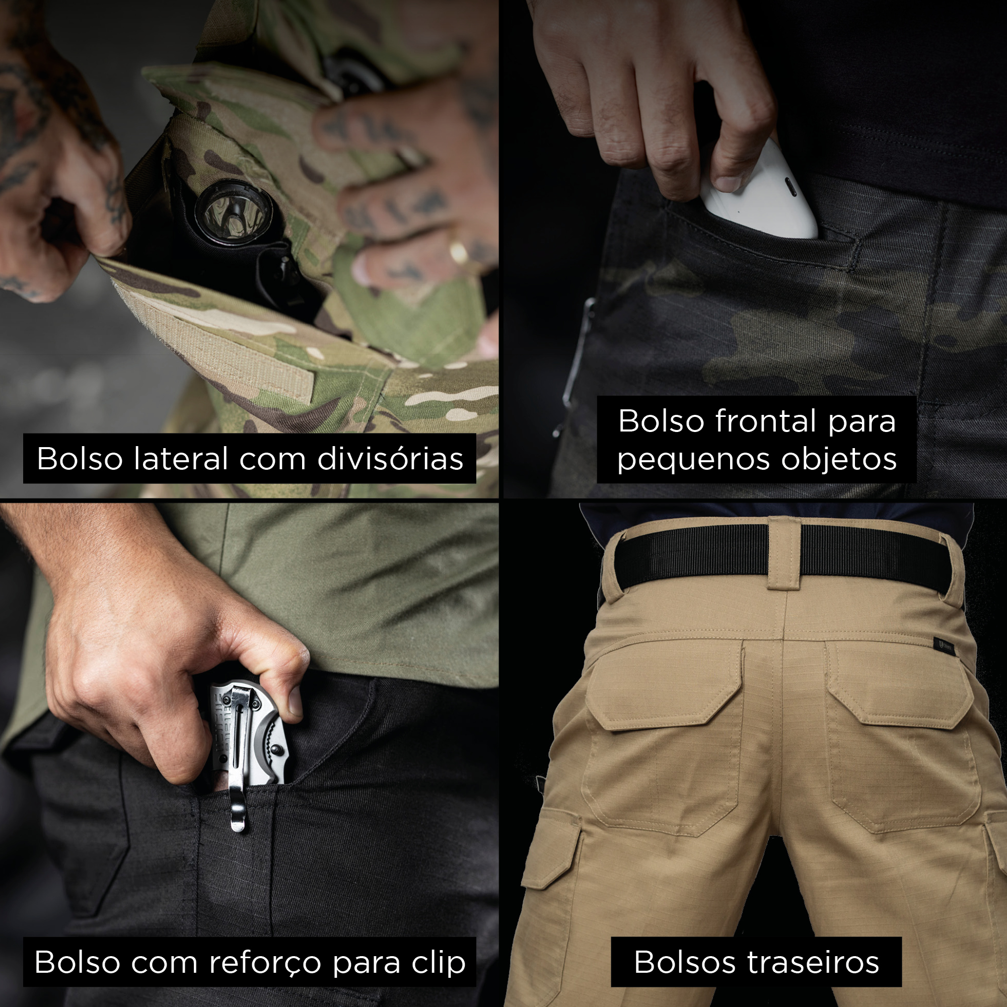 Mantenha todo o seu equipamento bem acomodado e organizado com os 7 bolsos da Calça Tática Range: 2 bolsos frontais com formato anatômico, com costuras duplas reforçadas, e com reforço especial para clipes como os de lanternas e lâminas. 1 bolso frontal embutido para guardar objetos menores de forma discreta e de rápido acesso como celular, chave do carro ou carteira. 2 bolsos amplos laterais nas pernas com subdivisões internas, 1 espaço maior e dois menores, para melhor organização dos seus equipamentos. 2 bolsos traseiros amplos e reforçados, com fechamento em velcro.