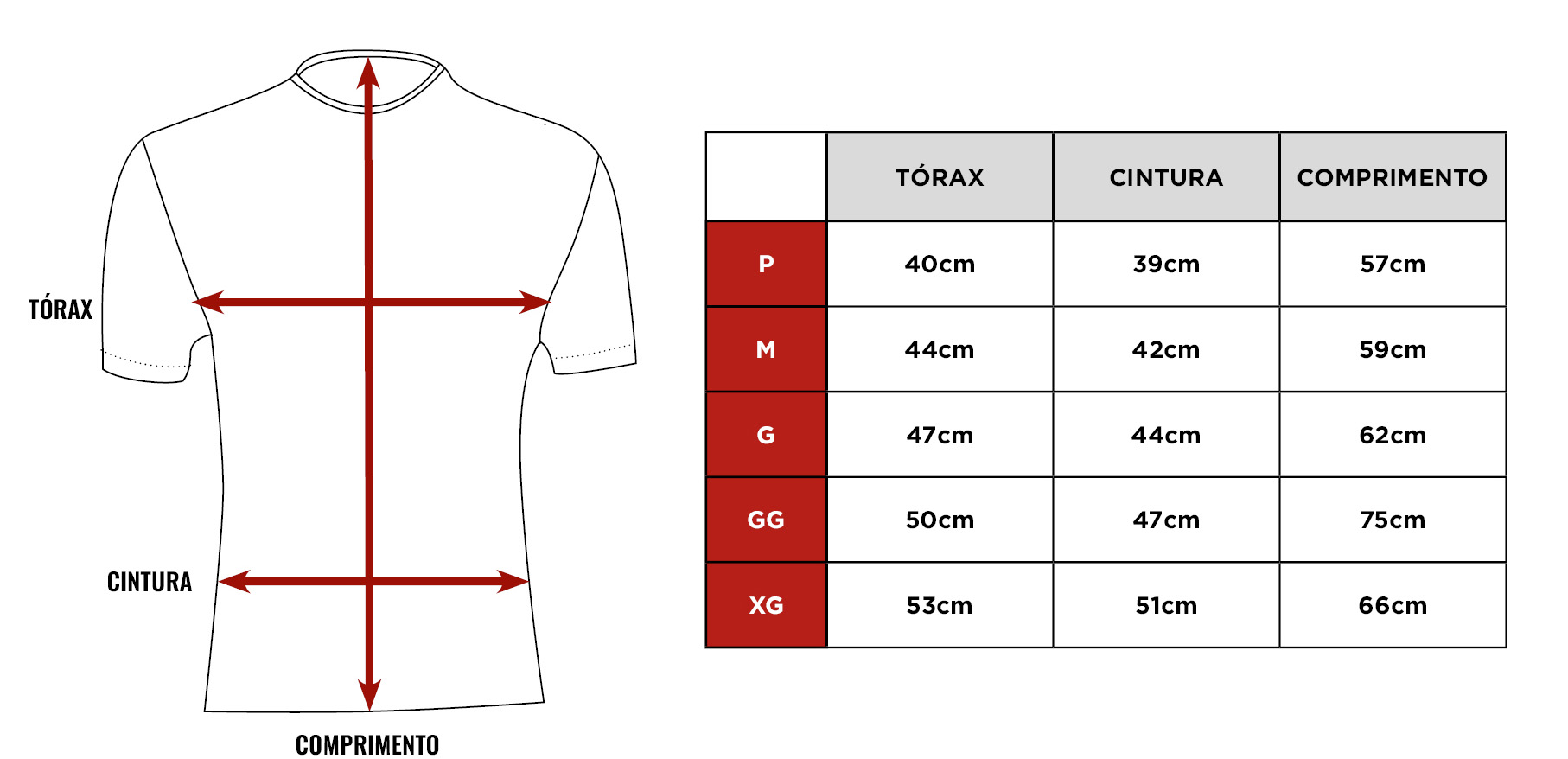 A tabela abaixo foi feita com base nas medidas da camisa. Não é medida do corpo. Compare com as medidas da camisa que você mais gosta. Todas as medidas podem ter uma variação de 1,5cm para mais ou para menos.