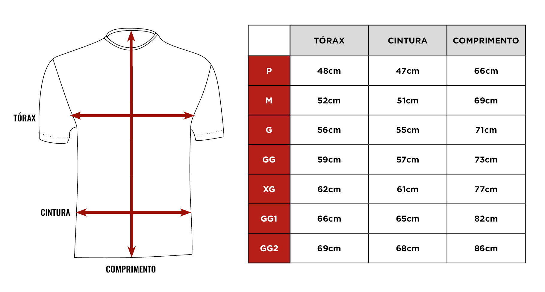A tabela abaixo foi feita com base nas medidas da camisa. Não é medida do corpo. Compare com as medidas da camisa que você mais gosta. Todas as medidas podem ter uma variação de 1,5cm para mais ou para menos.