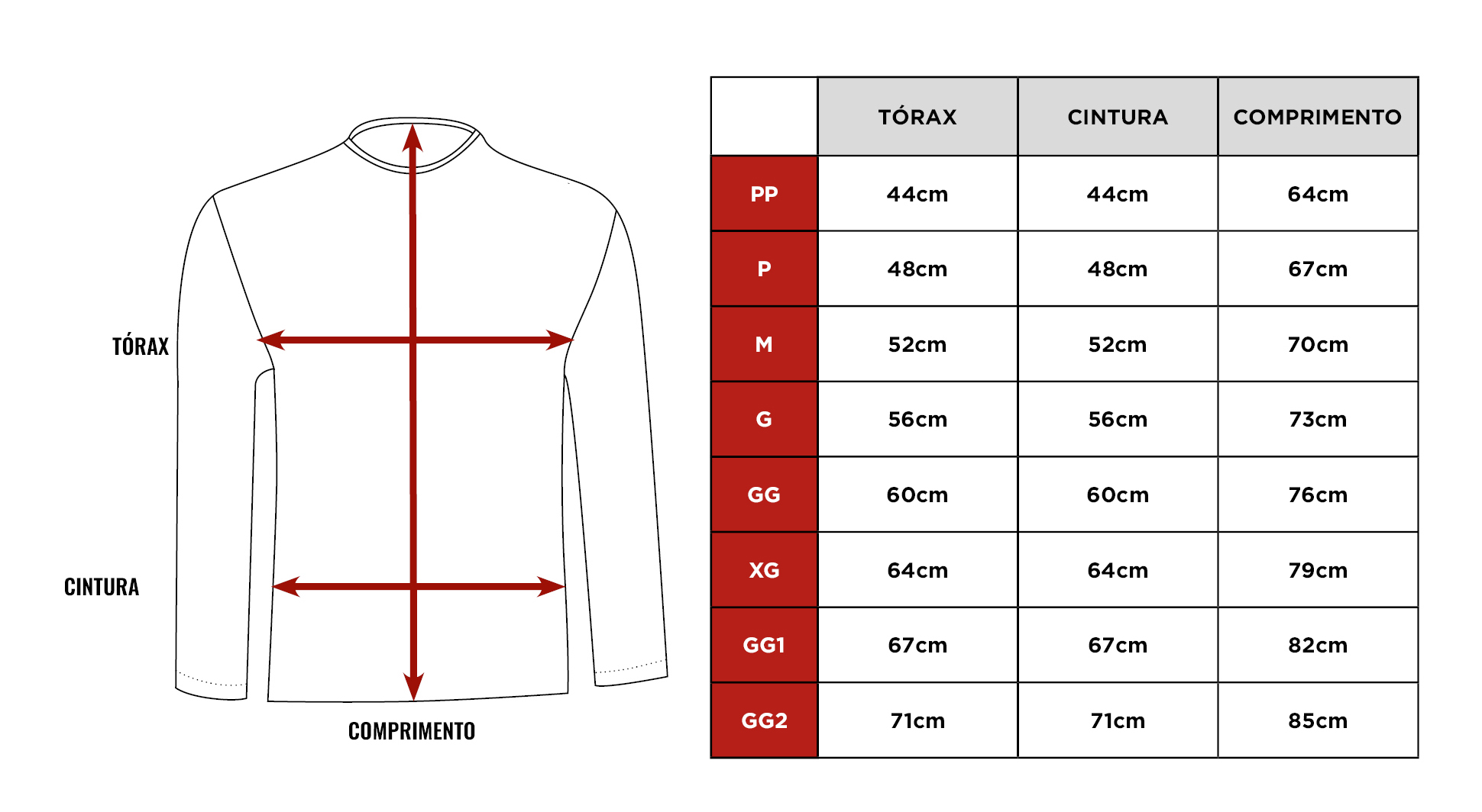 A tabela abaixo foi feita com base nas medidas da camiseta. Não é a medida do corpo. Compare com as medidas da camiseta que você mais gosta. Todas as medidas podem ter uma variação de 1,5cm para mais ou para menos.