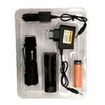 Recarregável, inclui bateria 18650 (2200 mAh), carregador de tomada e veicular
