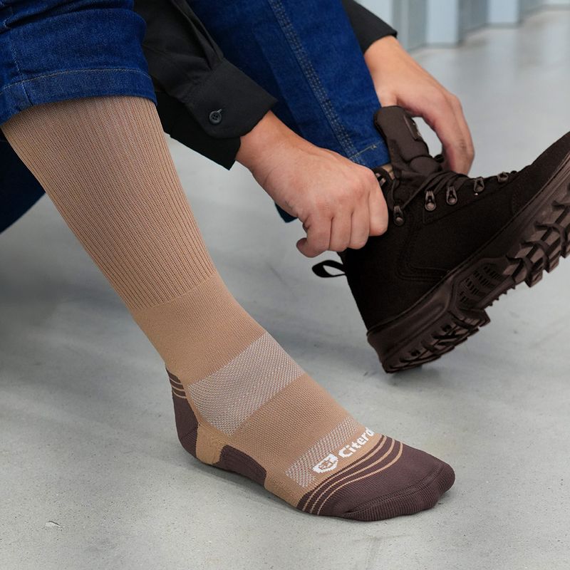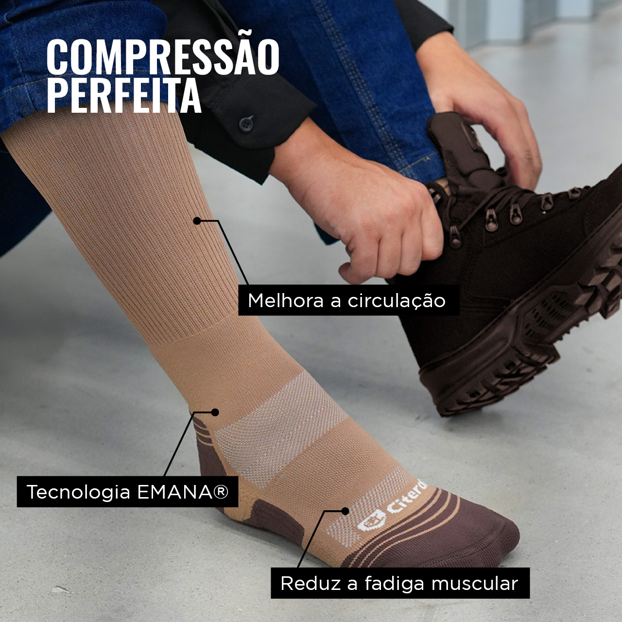 A Meia Elite Trooper da Citerol tem uma compressão ideal realizada por meio das fibras de EMANA, que auxiliam na circulação do sangue na perna para reduzir a fadiga muscular. Essa tecnologia permite que você se sinta bem, com sensação que está descansado, mesmo após longas jornadas utilizando botas e coturnos, ou depois de uma atividade física intensa.