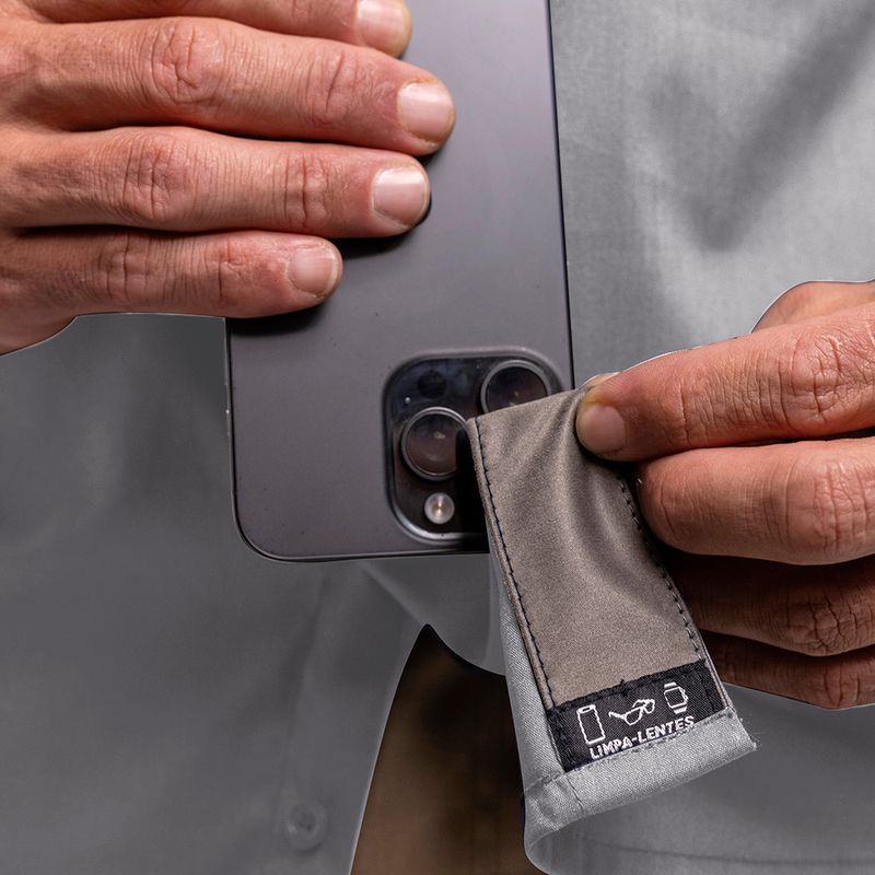 Se você precisa limpar ou desembaçar óculos, celular, relógio, câmera e outros itens sem correr o risco de arranhá-los, a Camisa Titan Air Pro tem um limpa-lentes na barra, confeccionado com flanela especial, para trazer mais praticidade.